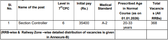RRB Section Controller Recruitment 2025: Total 368 Vacancies