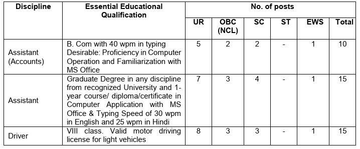 Assistant: Graduate degree in any discipline + 1-year course/diploma/certificate in Computer Applications (MS Office). Typing speed: 30 wpm (English) / 25 wpm (Hindi).